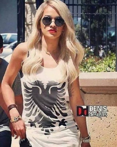 Në maj të këtij viti këngëtarja shqiptare që po mahnit botën – kosovarja me pashaportë britanike Rita Ora me fansat e saj dhe publikun e pati ndarë edhe këtë fotografi të cilën e ka vendosur përsëri në murin e saj të profilit në rrjetin social facebook – në të cilën ajo shfaqet e veshur me një kanatjere të bardhë të firmës D&D Denis Design – me shqiponjën e zezë të flamurit kombetar në pjesën e përparme të saj.